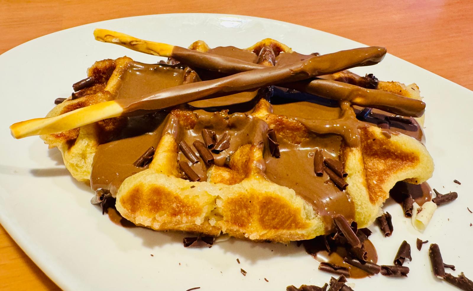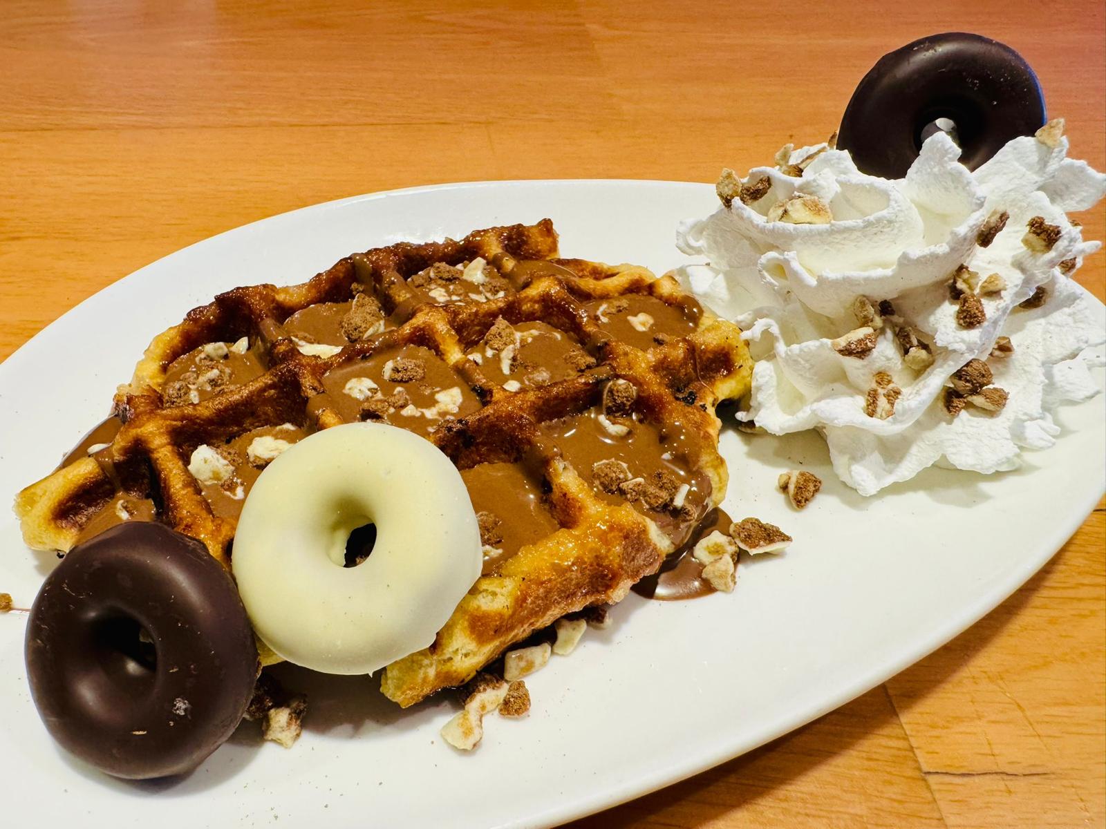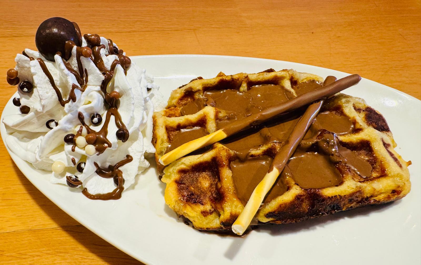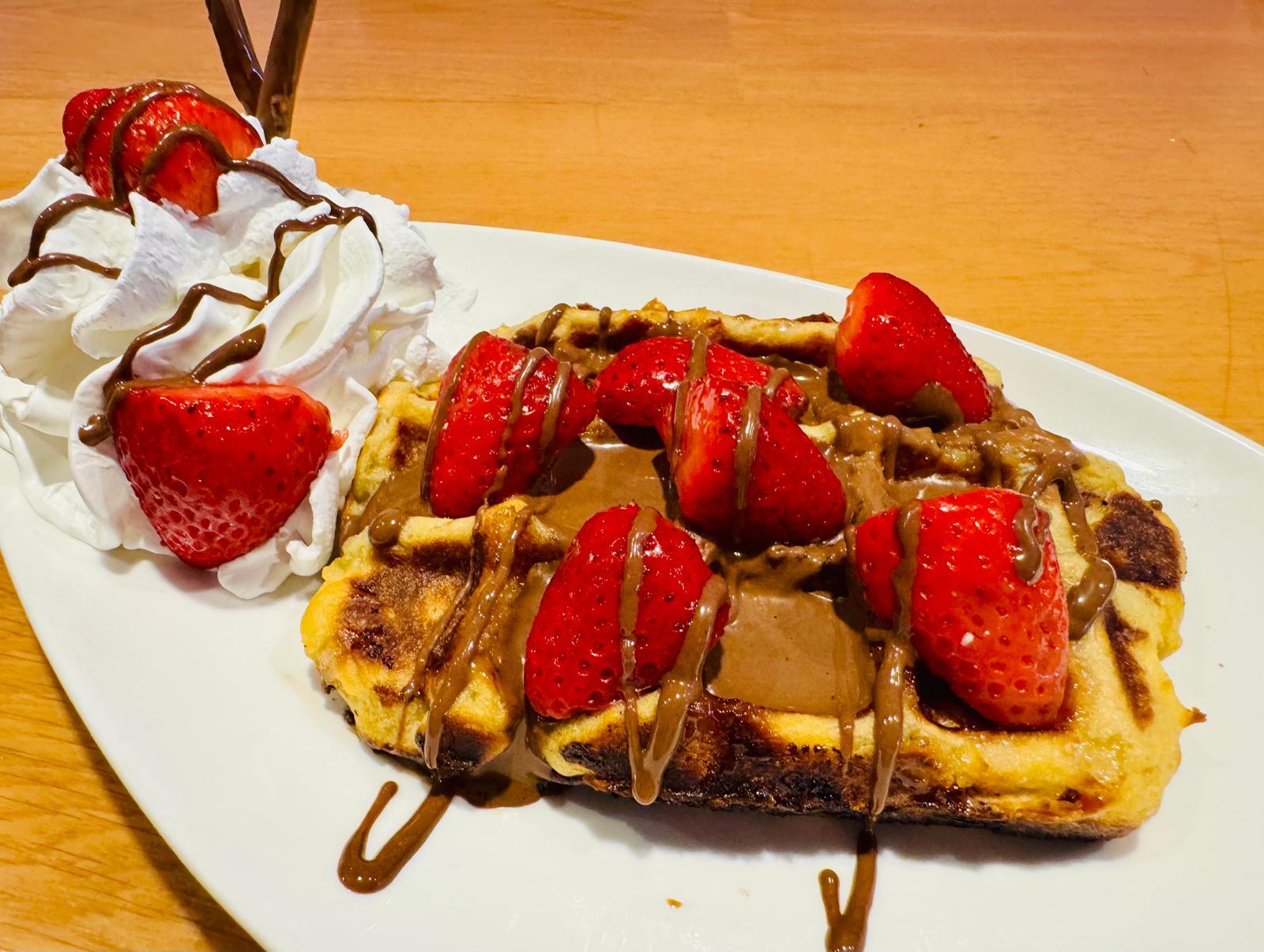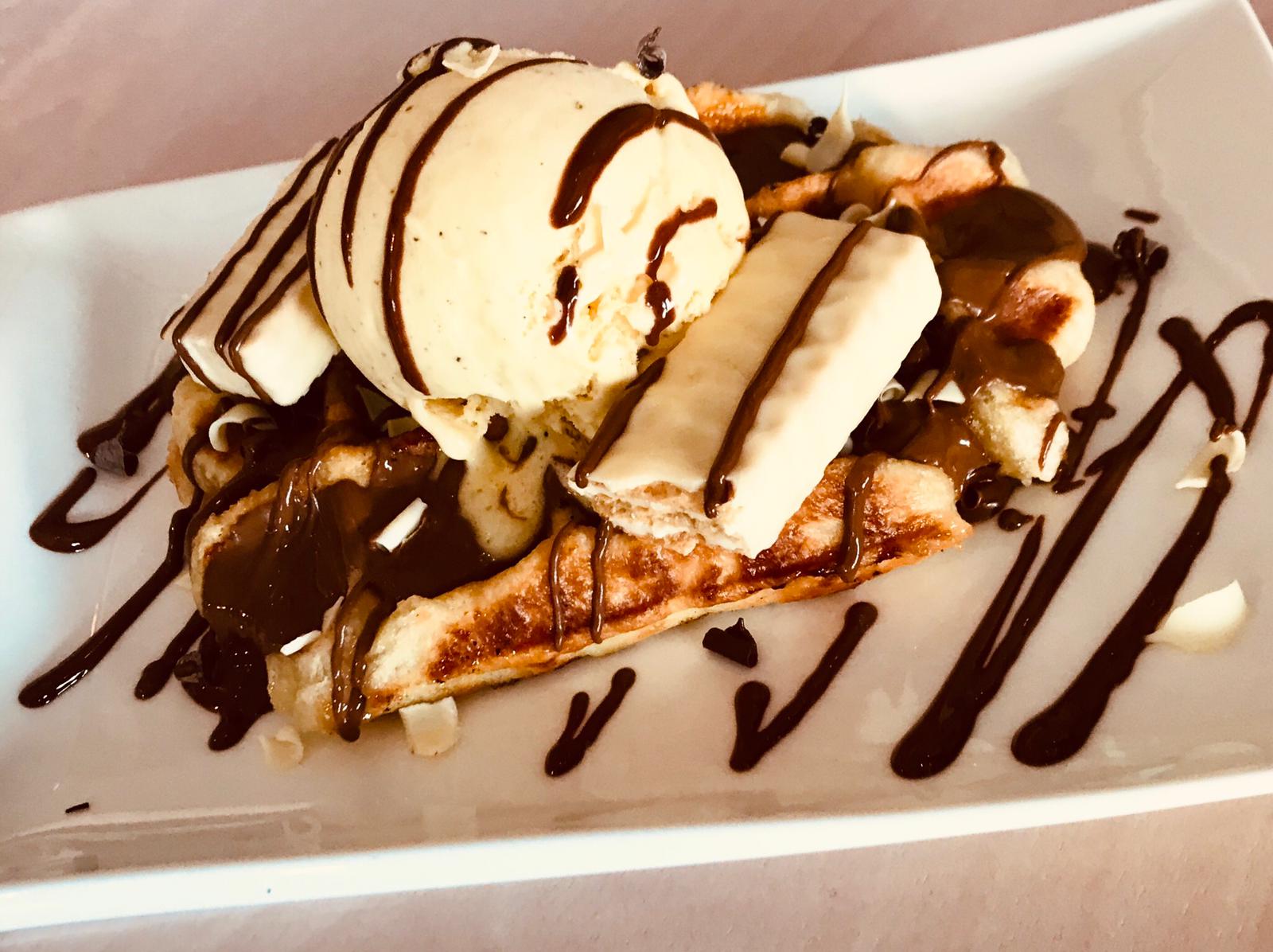 Elije de nuestra vitrina de helados tu sabor favorito y lo acompañas con Gofre artesano hecho al momento por nosotros, con fabulosa crema de chocolate y el topping que más te apetezca.