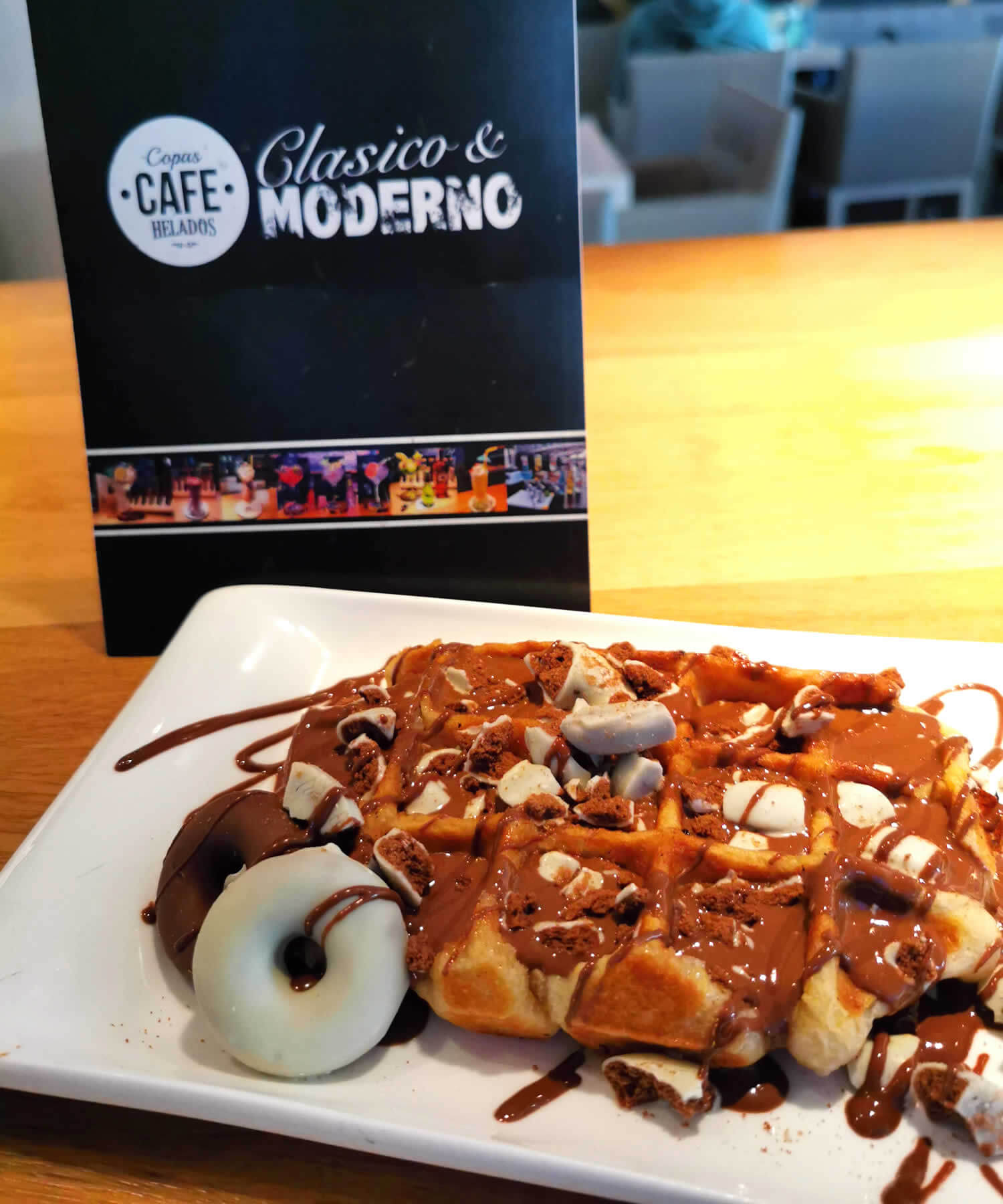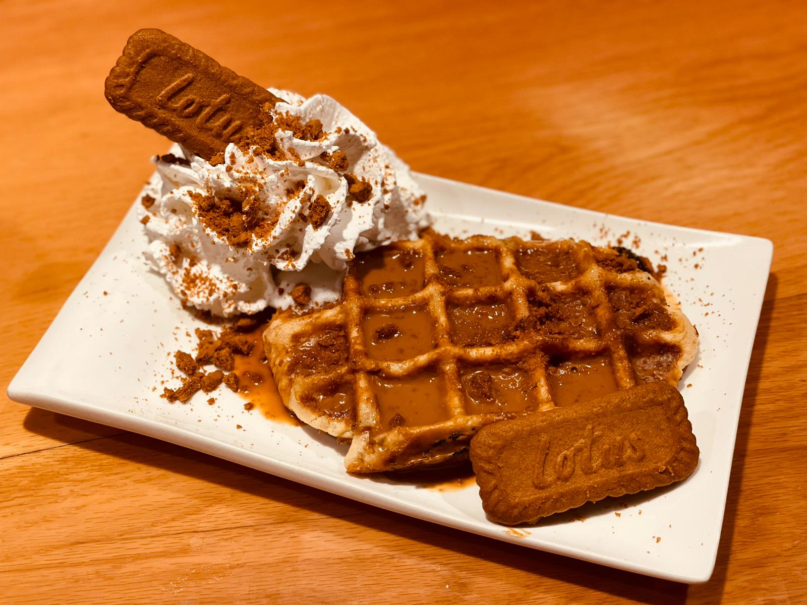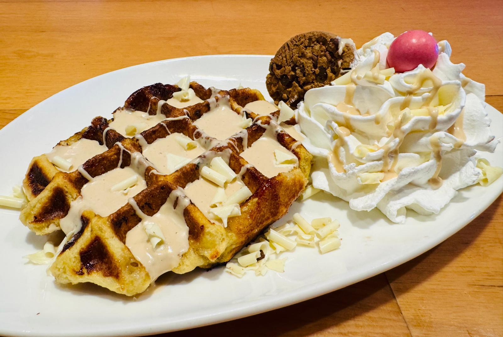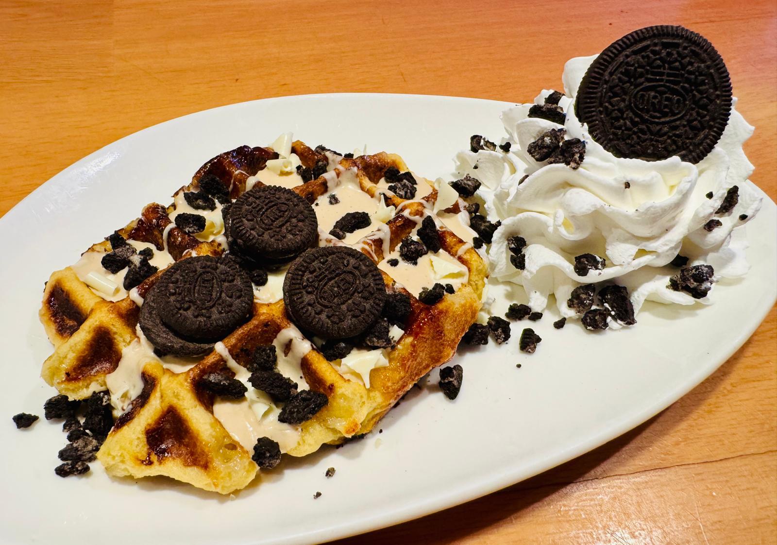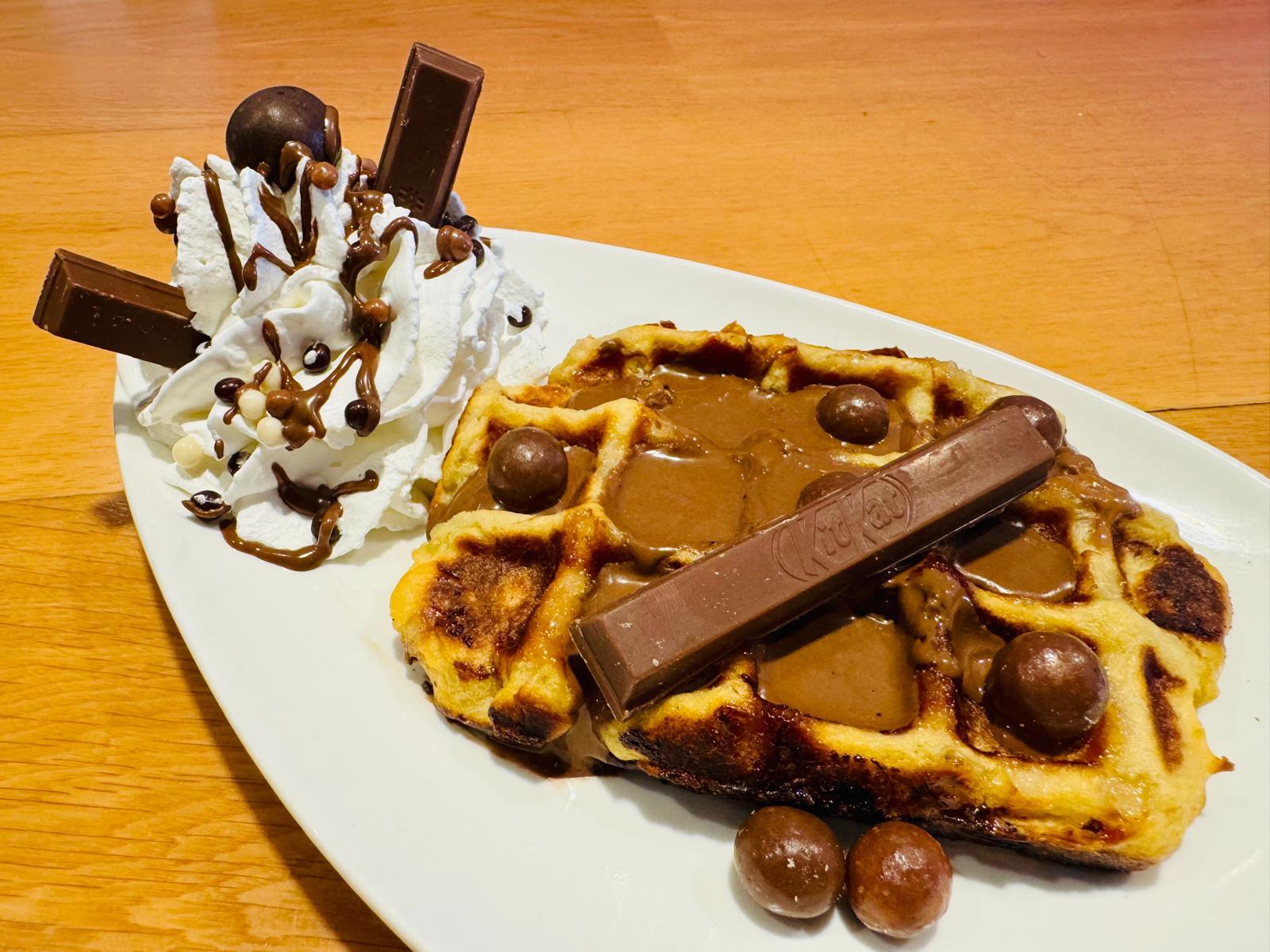 Elije de nuestra vitrina de helados tu sabor favorito y lo acompañas con Gofre artesano hecho al momento por nosotros, con fabulosa crema de chocolate y el topping que más te apetezca.